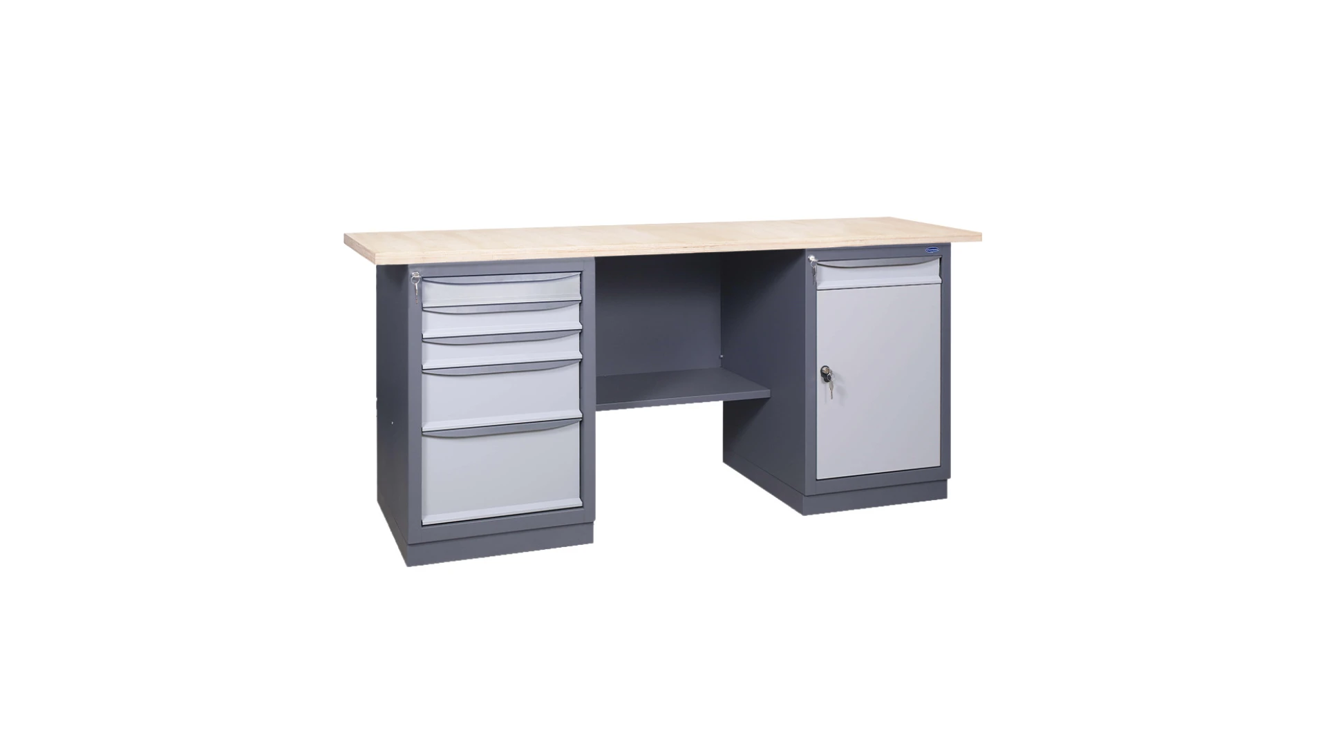 A munkapad kiváló minőségű acéllemezből készül. A munkapad kiegészíthető szerszámfallal. Munkaasztal kialakítása: egyik oldal három kis fiókkal, közepes és nagy fiókokkal, középen válaszfal, a másik oldal egy szekrény.
